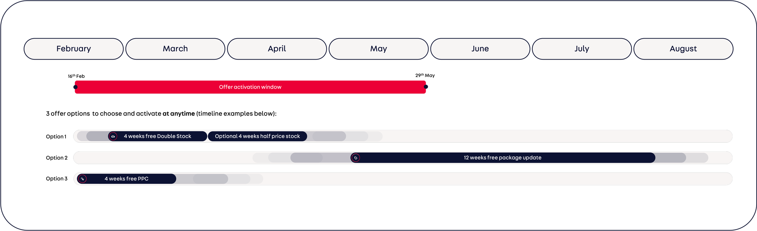 These offers are available to retailers on a Standard package or above. You can activate any one of these offers at any time between 16th February and 29th May. To qualify, your baseline stock and package level must remain as it is on the 31st January until you finish using your chosen offer. You decide which option best supports your goals and when to switch it on.